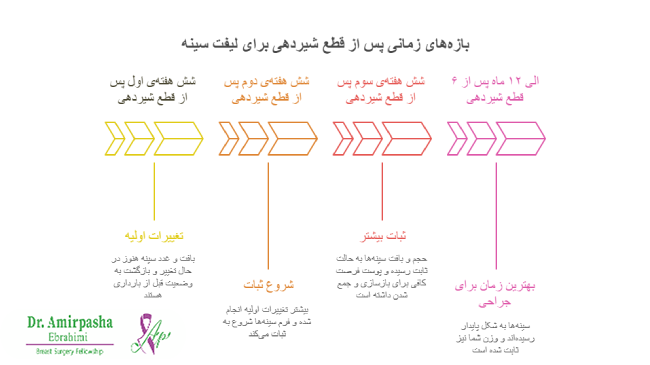 در دوران بارداری و شیردهی، بافت سینهها به دلیل افزایش فعالیت غدد شیری و تجمع چربی، رشد چشمگیری دارد. پس از پایان شیردهی، این بافتها به تدریج تحلیل میروند و حجم سینهها کاهش پیدا میکند. در برخی افراد این کاهش حجم با نوساناتی همراه است تا زمانی که بافتها به حالت پایدار برسند. اگر عمل لیفت در این مرحلهٔ ناپایدار انجام شود، احتمال تغییر فرم و افتادگی مجدد سینهها در آینده وجود دارد، زیرا شکل نهایی سینه هنوز تثبیت نشده است.